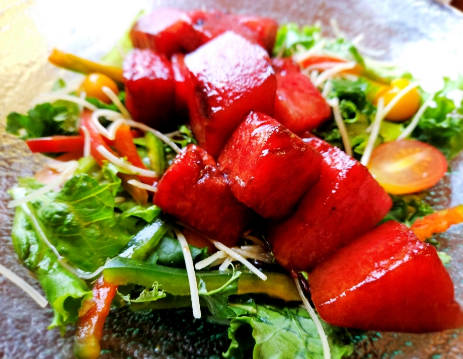 수박 샐러드를 주문했는데 나온 순간 비트인 줄 알았다는...발사믹 식초에 푹 절여서 주더라. 맛은 무난하였다.