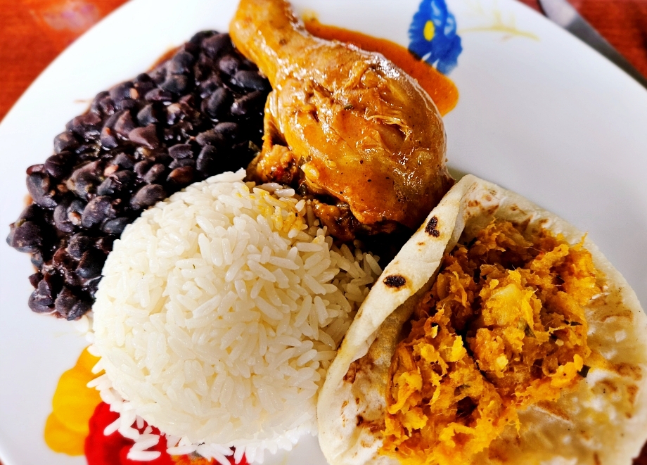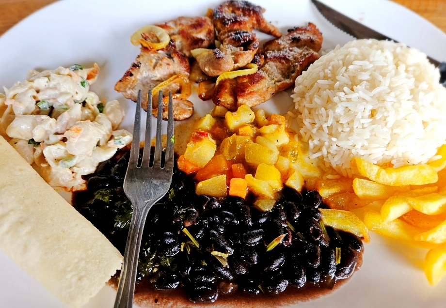 '카사도 (Casado)' 라는 전통음식: 쌀밥, 검정콩, 고기나 생선 종류, 채소 곁들임 조합.