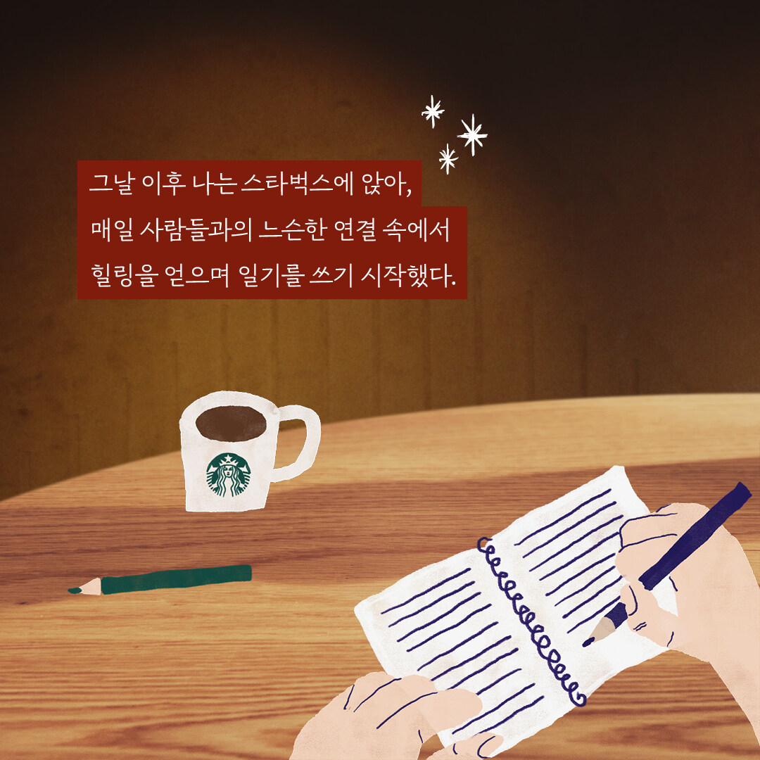 깨알같이 귀여운 점은, 일기마다 <오늘의 음료>를 적어놨다는 것. 가끔 <오늘의 음료> 없는 일기도 있어서 "어, 뭐지!" 하고 보면, 스벅에 가지 않고 집에서 일하거나 한 날.