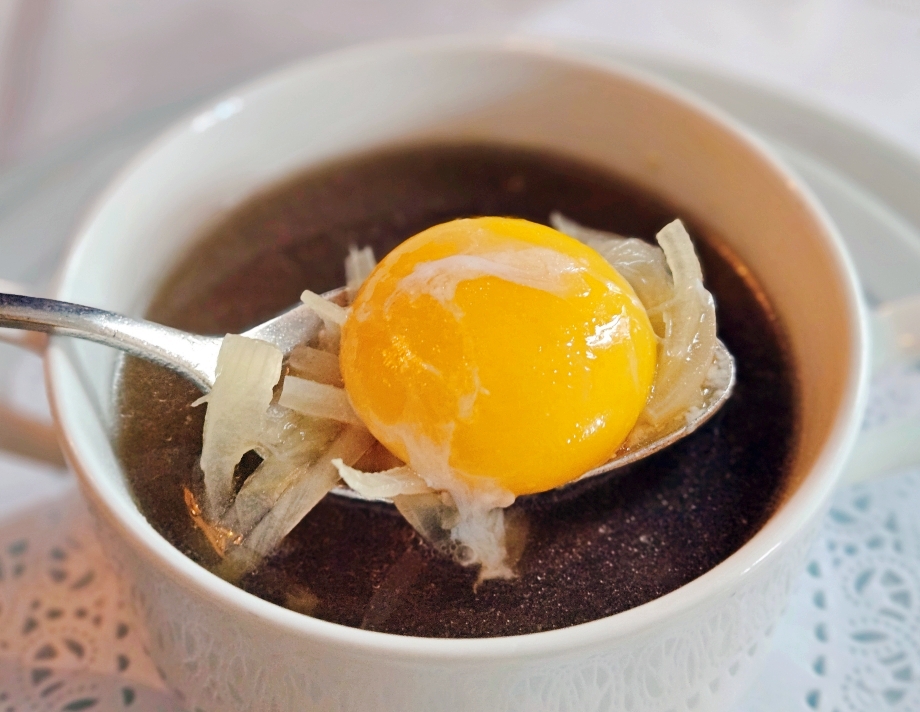 진하게 잘 끓여진 양파수프. 다만.. 노른자를 꿀꺽 삼켜야 하나 말아야 하나 잠시 고민했음.