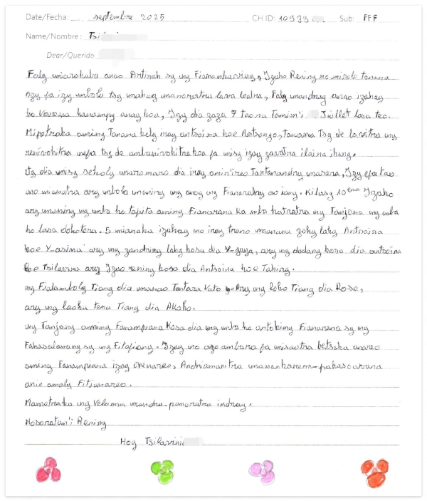 마다가스카르 여행 후, 계속 생각이 났다. 구정물 같은 강물에서 엄마를 도와 빨래하던 꼬맹이가. 가슴속에 모래바람이 부는 기분이었다. 그래서 여행 직후 마다가스카르 어린이 한 명을 후원하기 시작했는데 오늘 처음으로 편지를 받았다. 아직 어려서 (일곱쨜) 엄마가 대신 써줬단다. 아마 저 꽃 정도 자기가 그린 듯. ㅎㅎ