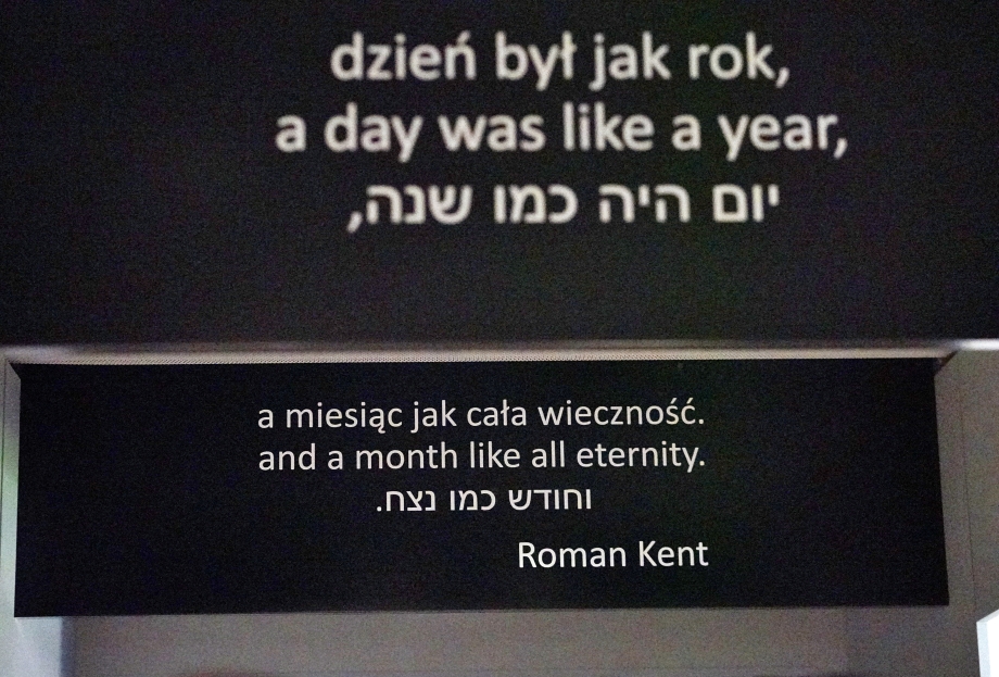복도 위에 걸린 생존자들의 증언: "(수용소에서의) 하루는 일 년 같았고 한 달은 마치 영원처럼 느껴졌다."