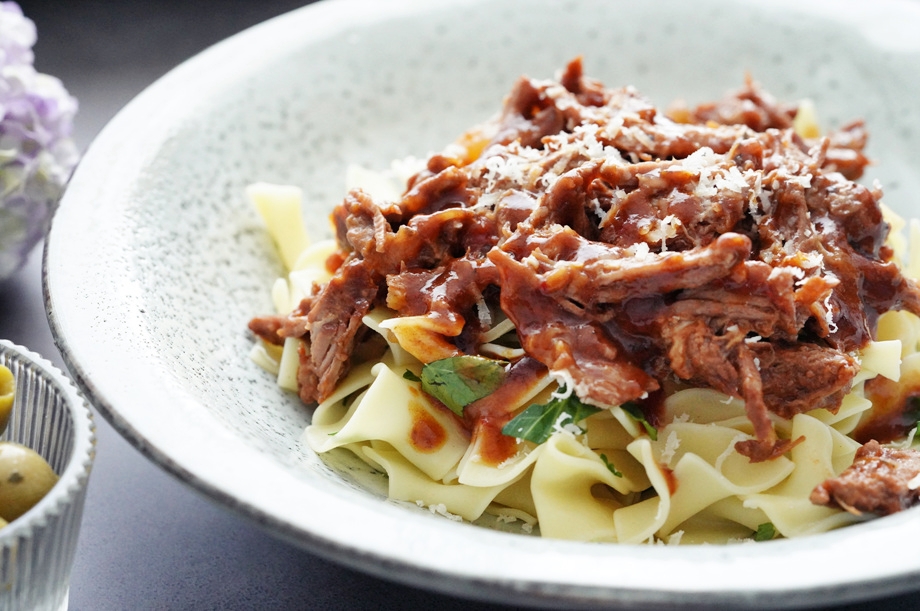 익은 고기는 연해서 잘 찢어지므로 삶은 파스타에 소스로 얹어 먹을 수도 있다.