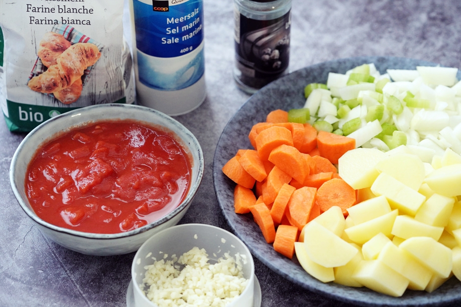 채소는 늘 단골로 들어가는- 양파, 샐러리, 당근, 감자- 그리고 다진마늘 조금. 으깬 토마토 한 개.