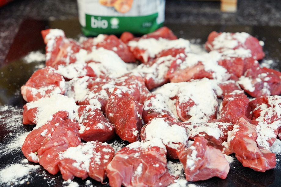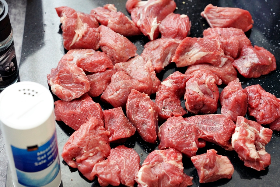 고기에 소금 후추로 밑간을 하고 (다 익으면 연해져서 포크만 갖다대도 잘라지므로 이보다 훨씬 큰 덩어리째로 써도 상관 없다)