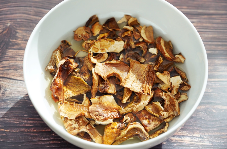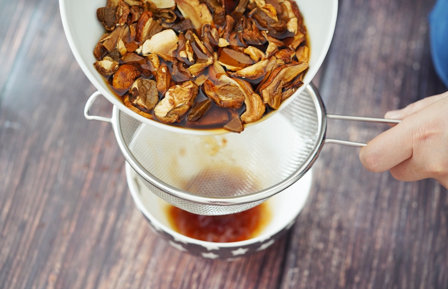 불려진 버섯을 건져서 건더기는 파스타에 넣고
