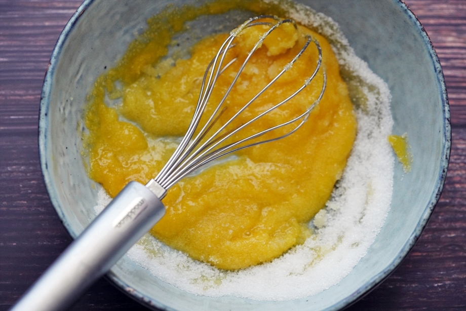 우유가 끓을 동안 계란노른자에 설탕을 섞고