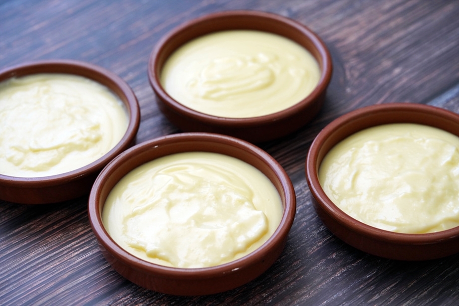 우유 500ml면 이 디저트 접시 (지름 10 cm, 높이 2.2 cm) 로 딱 네 개가 나온다. 냉장고에 넣어 2-4 시간 식힌다.