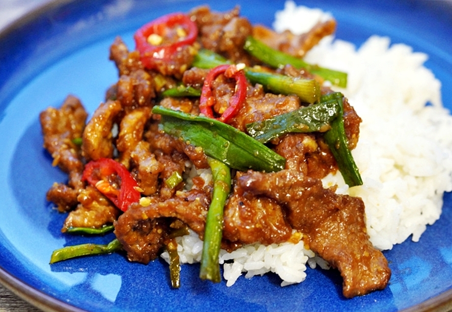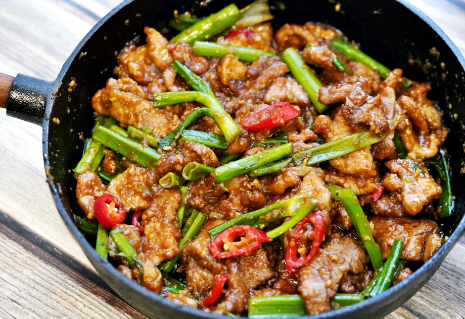 고기를 넣어 휘리릭 볶아내면 완성. 파는 가급적 늦게 넣는다. 이 요리를 팔아 왕부자가 되었다는- 아마 한국에도 있는- 레스토랑 P.F.Chang's 에 따르면 파가 아삭하게 살아있을 수록 더 맛나다고 한다.