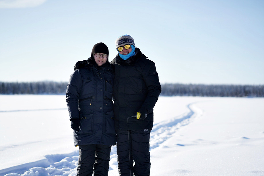 머무는 내내 영하 25도-30도를 꾸준히 유지하는 추위였는데 뭐니뭐니 해도 마지막 날이 진짜배기였다. 목적이 낚시가 맞는지 아님 북극체험인지 아직도 잘 모르겠는...아무튼 이름은 ice fishing 이었던 이 날의 프로그램. 이 길다란 썰매로 숲속을 40분쯤 달려 낚시터 (얼어붙은 호수)로 가는데, 진짜 듁음의 추위를 맛보았다.