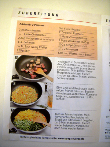 아무튼. 그래도 희망적인 것은, 레서피를 주면 따라하는 건 그다지 싫지 않다는 점. COOP (스위스의 대표격 수퍼마켓 체인) 에서 매달 '이 달의 요리' 가 나오는데 이 레서피를 모아서 가끔 따라한다.