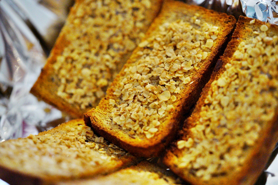 오트밀 남은 부스러기를 묵은 식빵 위에 뿌려 아침에 먹을 토스트를 구웠고