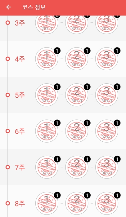 오늘은 8주코스의 마지막 달리기였다. 쉬지 않고 30분 달리기. 길었던 8주. 인고의 8주! 비록 빼야 할 살이 아직도 5kg이나 남았지만 오늘만큼은 이 성취감을 즐기겠다. 해냈노라! 믿을 수 없노라!