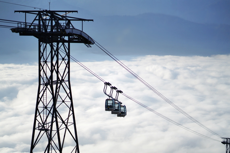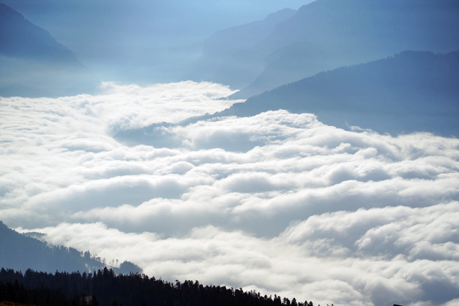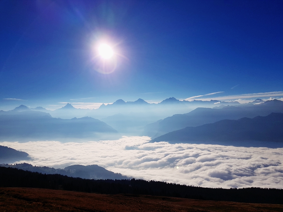 보이는 것은 구름의 바다. 내리쬐는 태양, 파란하늘, 안개 속 알프스.