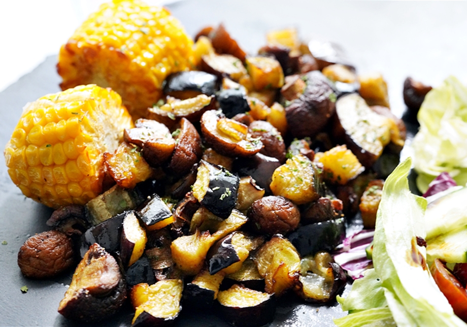 반쪽은 샐러드, 다른 반쪽엔 에어프라이어에 구운 채소 (가지, 버섯, 옥수수).