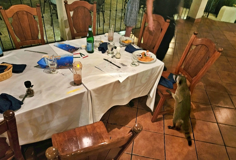 조식을 먹는데 너구리 같은게 지나가는 거였다. 한 30초 후에 또 한마리, 그리고 커피 한모금 마시고 돌아보니 또 지나가고 있었다. 쟤 왤케 왔다 갔다 하냐 했드만 알고 보니 여러 마리였던 것. Coati (라쿤과 비슷한)들이라고. 호텔 안에서 거리낌없이 돌아다니고 있었다.