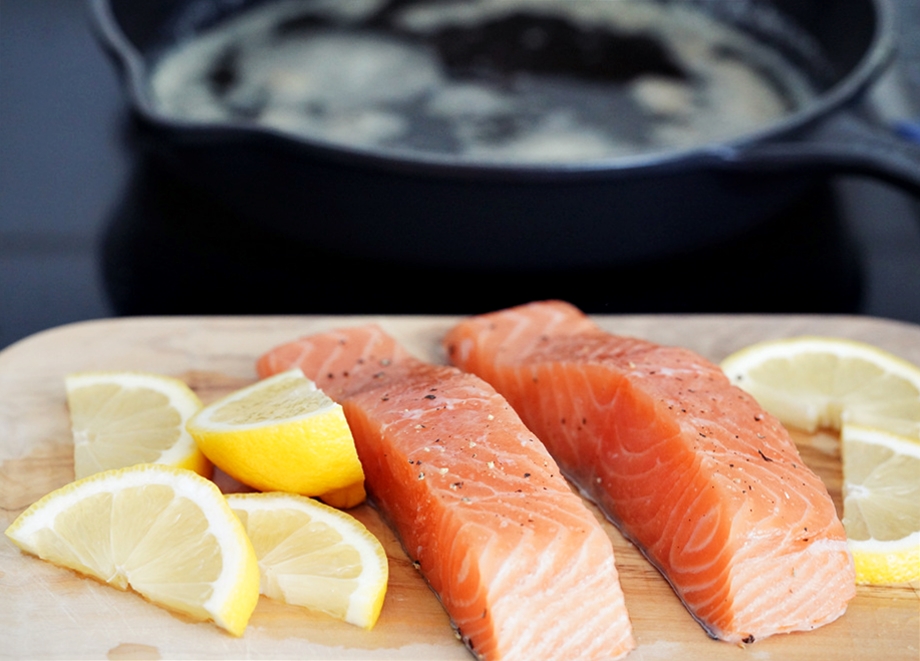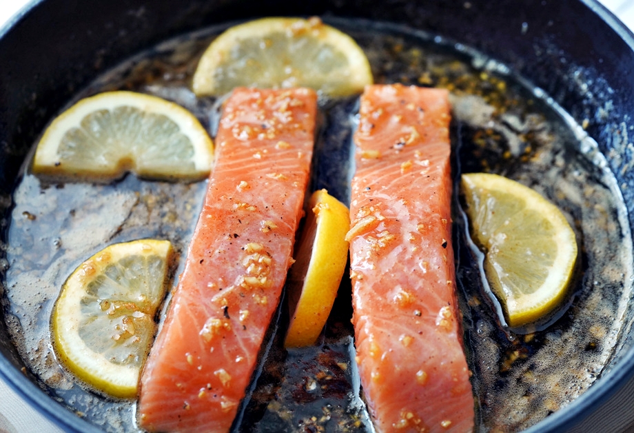 이 소스를 연어에 고루 끼얹고 레몬 몇 조각도 주위에 곁들인다. 200°C 오븐에서 브로일러로 8-10분 정도 굽는다.