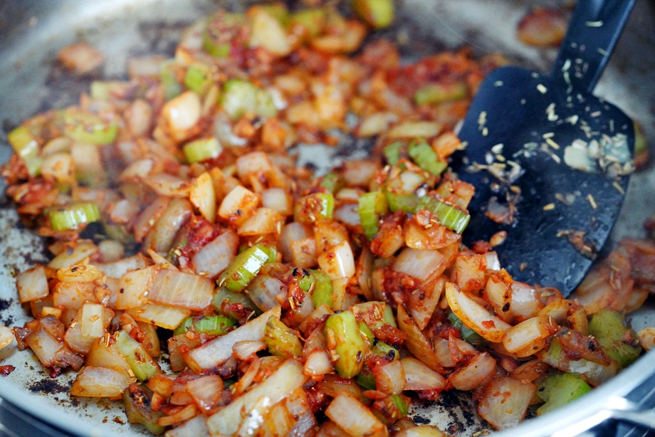 고기 구운 팬에 양파+샐러리+마늘을 볶다가 토마토 페이스트를 좀 넣고 더 볶는다.