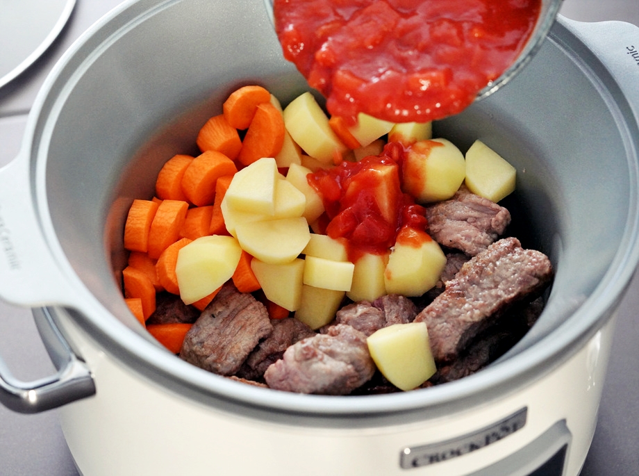 고기, 채소, 다진 토마토를 슬로우쿠커에 다 넣고 소스를 부어 4-6시간 정도 익힌다. 몇 번 얘기한 적이 있듯이 나는 슬로우쿠커를 매우 아낀다. 낮은 열로 계속 끓이는 단순한 조리기구에 불과하지만 편리한 점이 꽤 많다. 일단 고기요리의 경우 백전백승 늘 연하게 익혀줄 뿐 아니라, 익는 속도가 현저히 다른 재료들을 한꺼번에 넣어도 상관 없으며, 오래 익혀도 채소의 형체가 잘 유지된다.