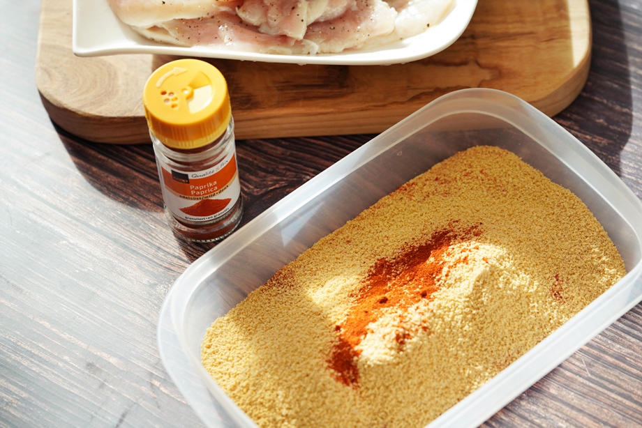 파스타가 감칠맛이 강할거라서 같이 먹을 치킨커틀릿은 조금 매콤하게 하려고 매운 파프리카 가루를 섞었다.