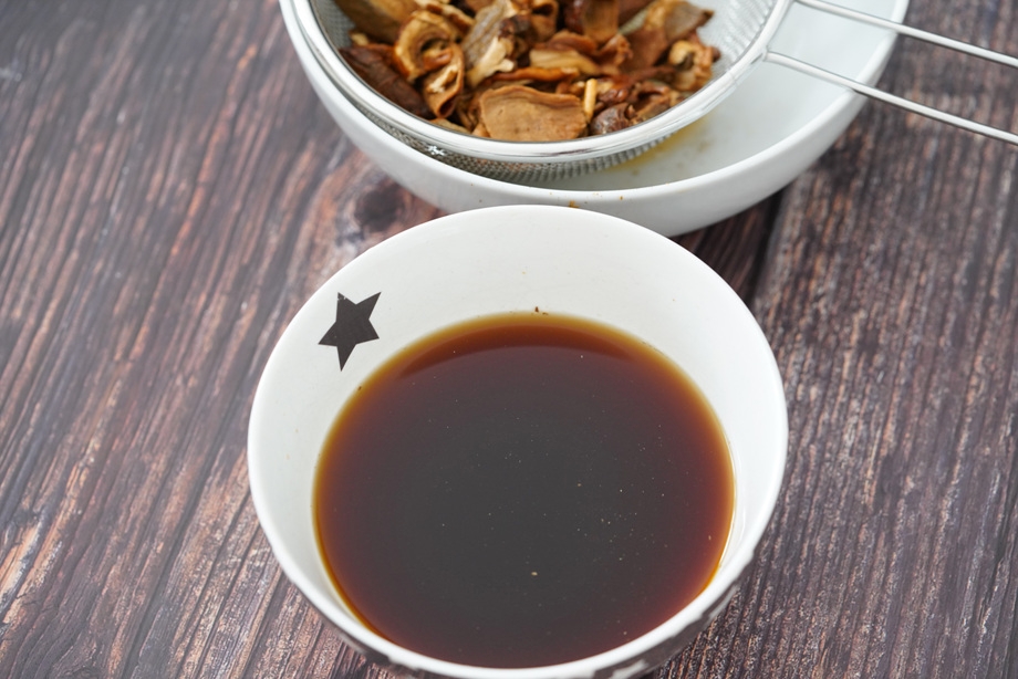 불려진 버섯을 건져서 건더기는 파스타에 넣고