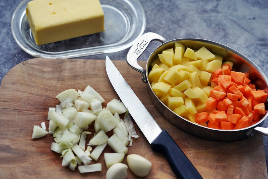 녹인 버터에 감자, 당근, 양파, 마늘을 볶다가