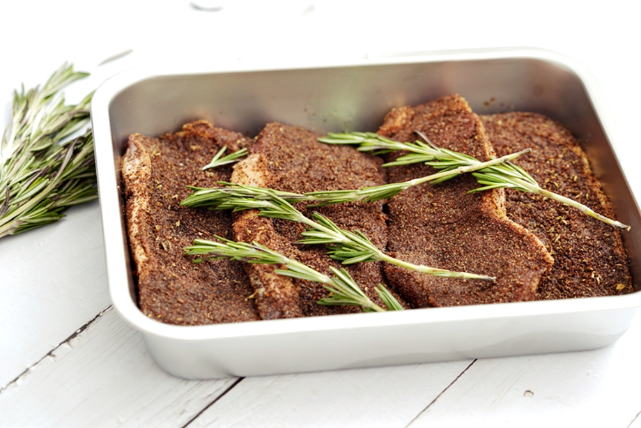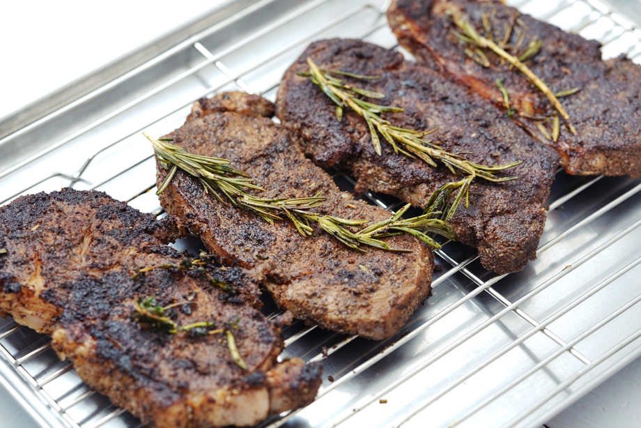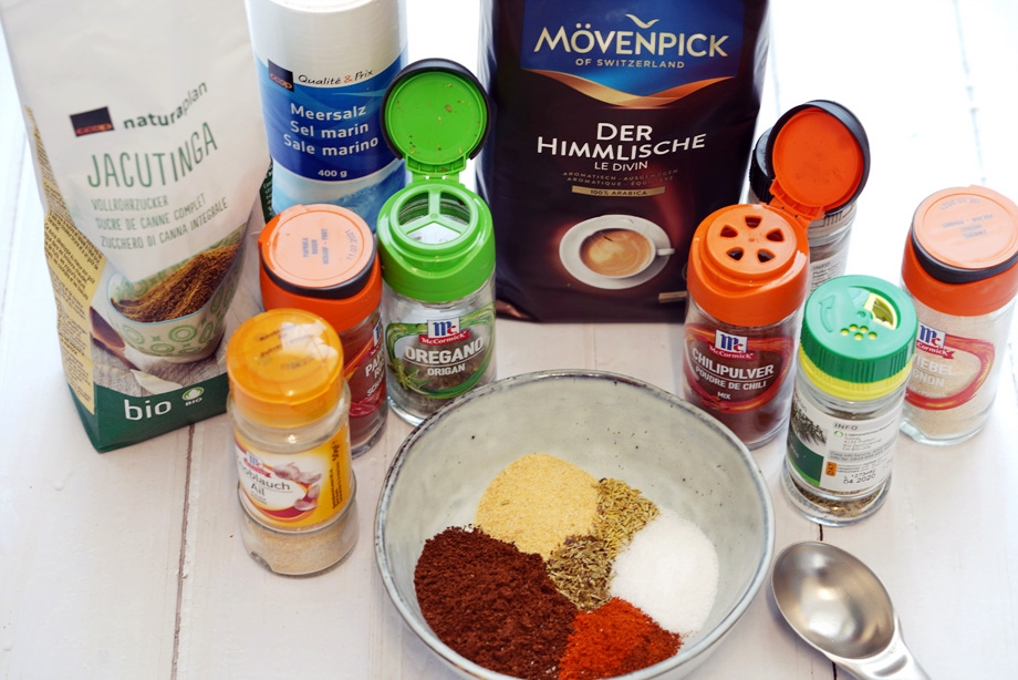 커피가루(4T), 소금(2T), 후추(1T), 황설탕(2T), 옵션으로 칠리가루, 마늘가루, 양파가루, 허브를 섞어서 양념믹스를 만들고