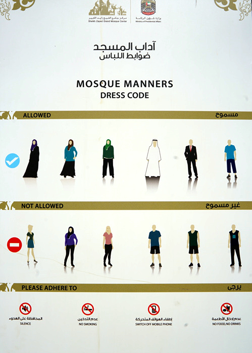 조금이라도 장난스런 사진촬영은 금지되어 있다. 모스크 앞마당에 함부로 들어가서도 안된다. 미국가수 리아나가 규칙위반 사진을 찍다 쫓겨난 전례가 있는 사원이기도 하다.