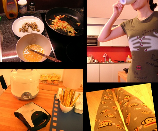 밥솥은 한국에서 가져온 쿠쿠 3인용, 쌀은 요 앞 아시아 수퍼마켓에서 살 수 있고. 밥솥 앞에 보이는 건 얼마 전에 산 샌드위치 토스터 (아아 후회해 후회해 -_-) 아, 그리고. 스위스의 착한 점 중 하나는 물이 좋다는 것이어서 굳이 생수를 사 마시지 않아도 된다는 게 마음에 든다. 세수를 하면 온천물에 씻었을 때처럼 매끈매끈한데 여기 온 이후로는 얼굴에서 각질을 찾아볼 수 없게 되었다. 저 웃긴 홈웨어는 -_-; 언니가 준 티셔츠. 그리고 5천원짜리 원숭이 바지.