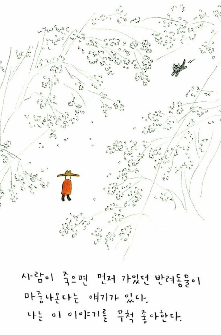 일러스트 작가 '스노우캣' 의 반려묘 나옹이 세상을 떠났다고 한다. 스노우캣네 집에 처음 왔던 순간부터 나를 비롯한 수많은 이모/삼촌 집사들을 만들어 낸 나옹.. 그들 모두는 오늘 이별에 가슴 아렸을 것이다. 17년을 함께 한 고양이를 떠나보내는 말로 표현 못할 마음은.. 18년을 함께 한 개를 보내본 사람으로서 얼추 가늠할 수 있다. 작가의 작품 '마중' 처럼, 그녀의 나옹은, 그리고 나의 개도, 언젠가 그렇게 마중 나와 줄 것이다.